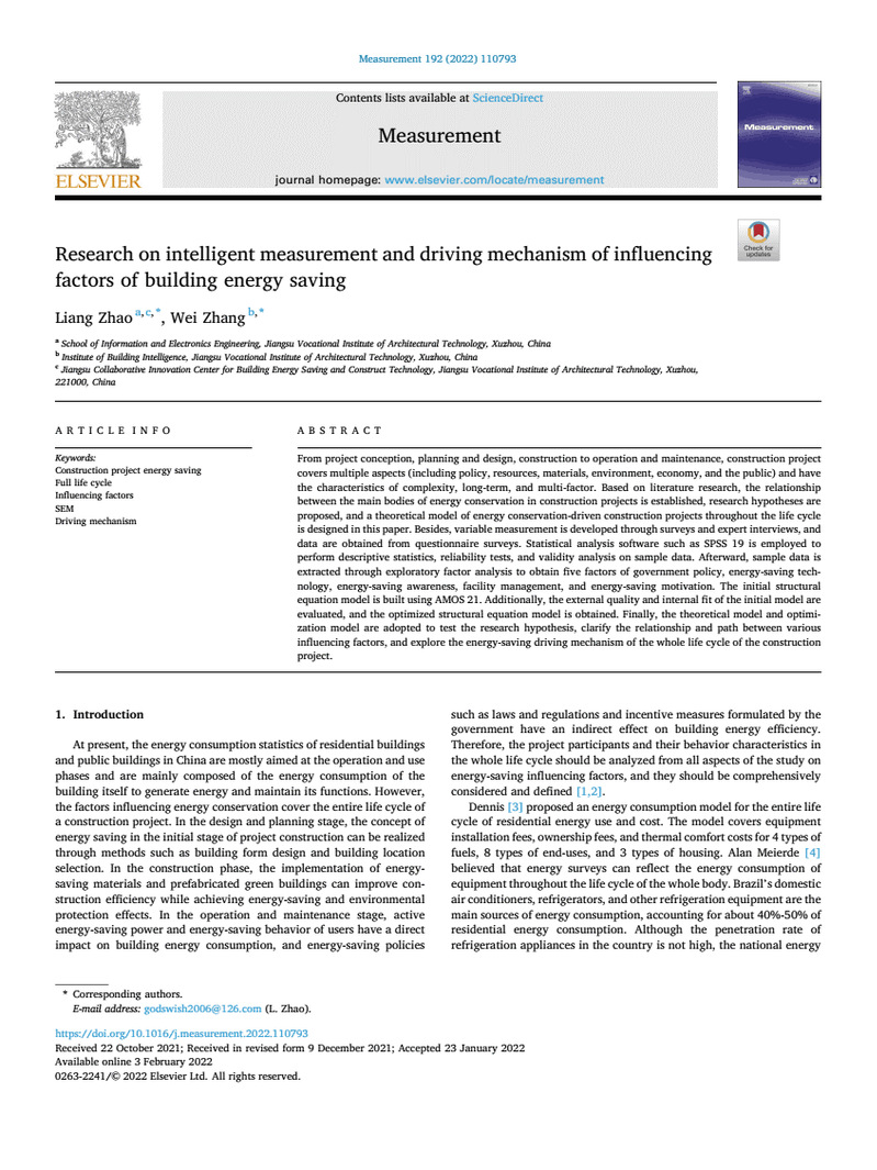 建设项目从构思、规划、施工到运营,涉及政策、资源、材料、环境、经济、公众等多个方面,具有复杂性、长期性、多因素的特点。我国住宅建筑和公共建筑的能耗统计大多针对运营和使用阶段,主要由建筑本身产生能源和维持其功能的能耗构成;然而,影响节能的因素涵盖了建设项目的整个生命周期。公司赵亮副教授在节能影响因素的智能测量与驱动机理研究方面取得研究进展,形成论文《Research on intelligent measurement and driving mechanism of influencing factors of building energy saving》,在国际测量领域权威刊物《Measurement》(JCR 1区,IF: 3.778)上发表。该文分析了项目全生命周期节能利益相关者的作用关系,从政策、技术、公众、运维等维度提出全生命周期节能意愿的研究假设,通实证研究提取出包含37个二级测量指标的5个因子,使用结构方程模型对全生命周期节能影响因素的驱动机理进行研究。