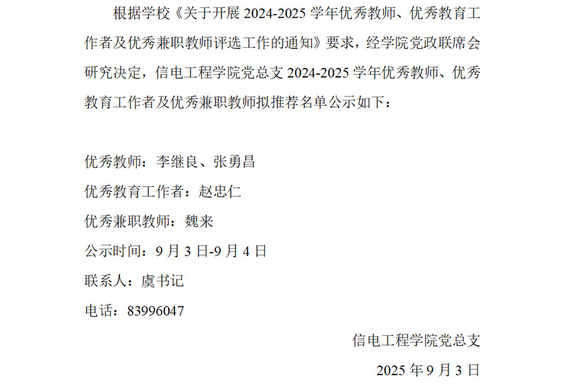 公司党总支2024-2025学年优秀教师、优秀教育工作者及优秀兼职拟推荐名单公示