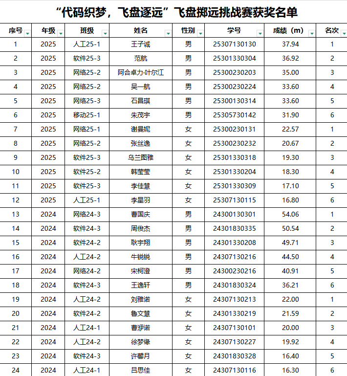 本次比赛采用175g飞盘,比赛时参赛者站在直径为2.5米的圆内,将飞盘投掷出去,丈量距离为飞盘的最终落地点至投掷区前沿。每位参赛者在规定时间2分30秒内投掷3次,取最远的一次作为比赛成绩。经过激烈的角逐,获奖名单如下: