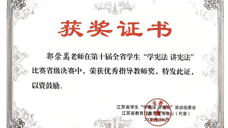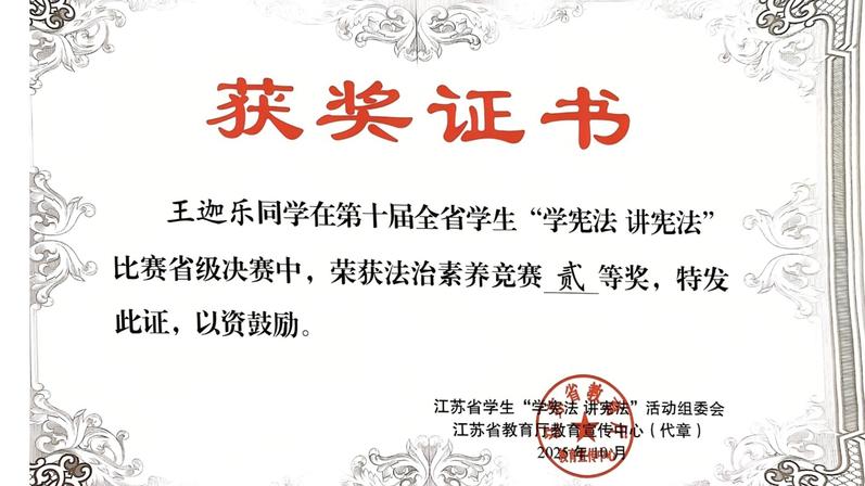 近日,由江苏省教育厅主办的第十届江苏省员工“学宪法 讲宪法”活动公布获奖名单,公司人工智能24-2班员工王迦乐获二等奖,辅导员郭崇嵩获“优秀指导教师”称号,公司也是全省唯一晋级省级决赛的高职院校。
